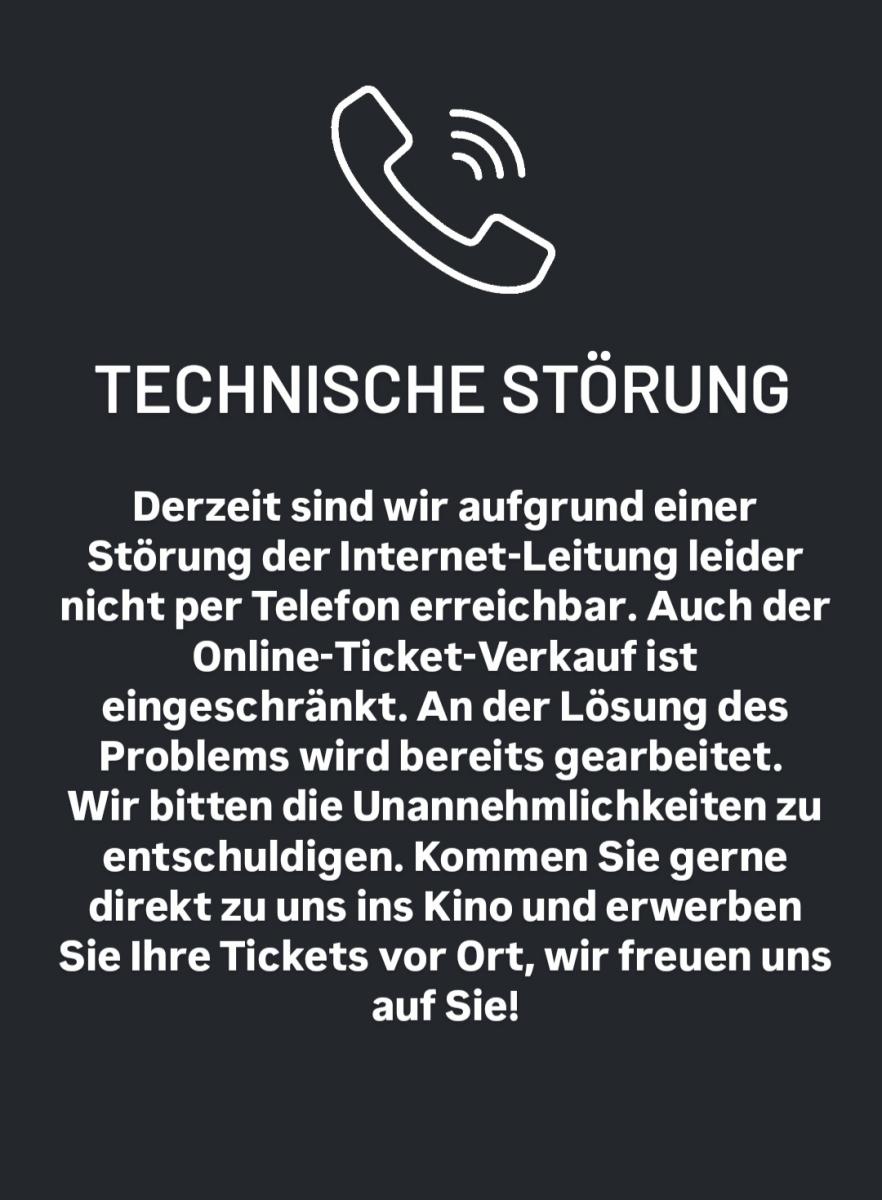 Derzeit sind wir aufgrund einer Störung der Internet-Leitung leider nicht per Telefon erreichbar. Auch der Online-Ticket-Verkauf ist eingeschränkt. An der Lösung des Problems wird bereits gearbeitet. Wie bitten die Unannehmlichkeiten zu entschuldigen. Kommen Sie gerne direkt zu uns ins Kino und erwerben Sie Ihre Tickets vor Ort, wir freuen uns auf Sie!